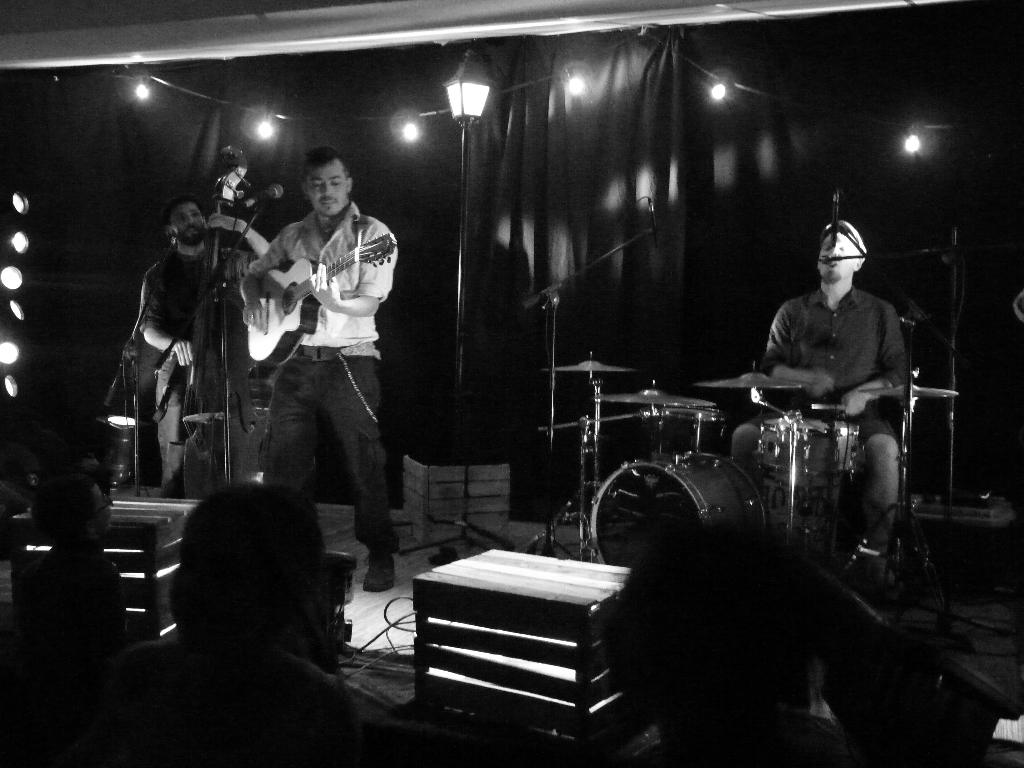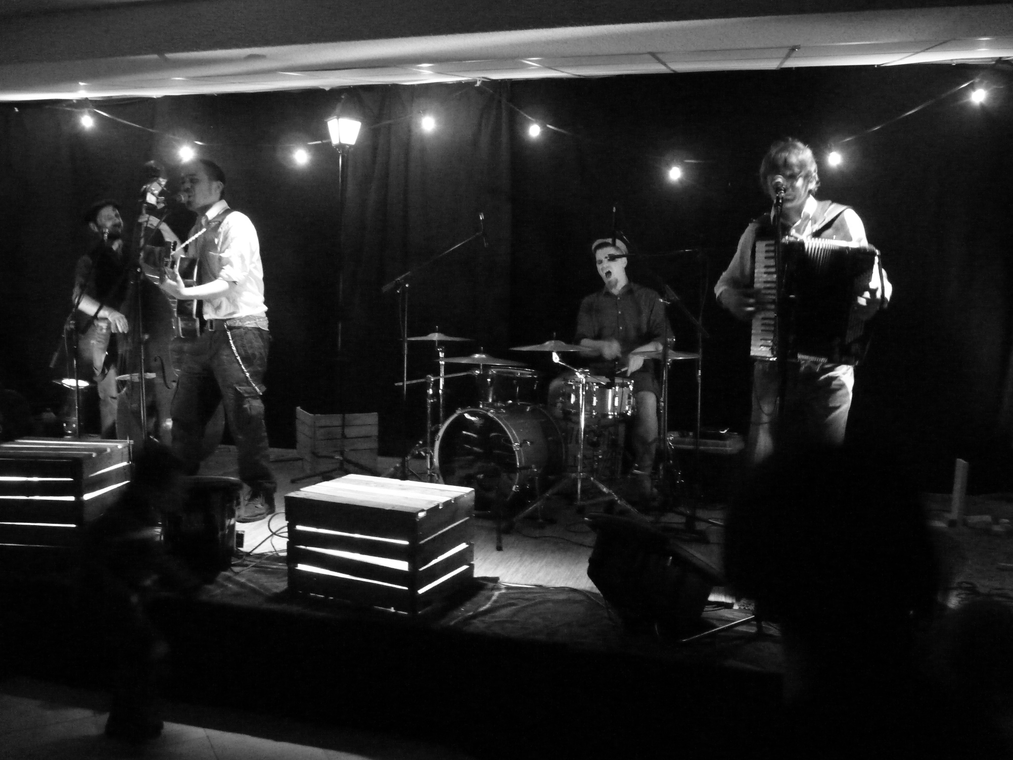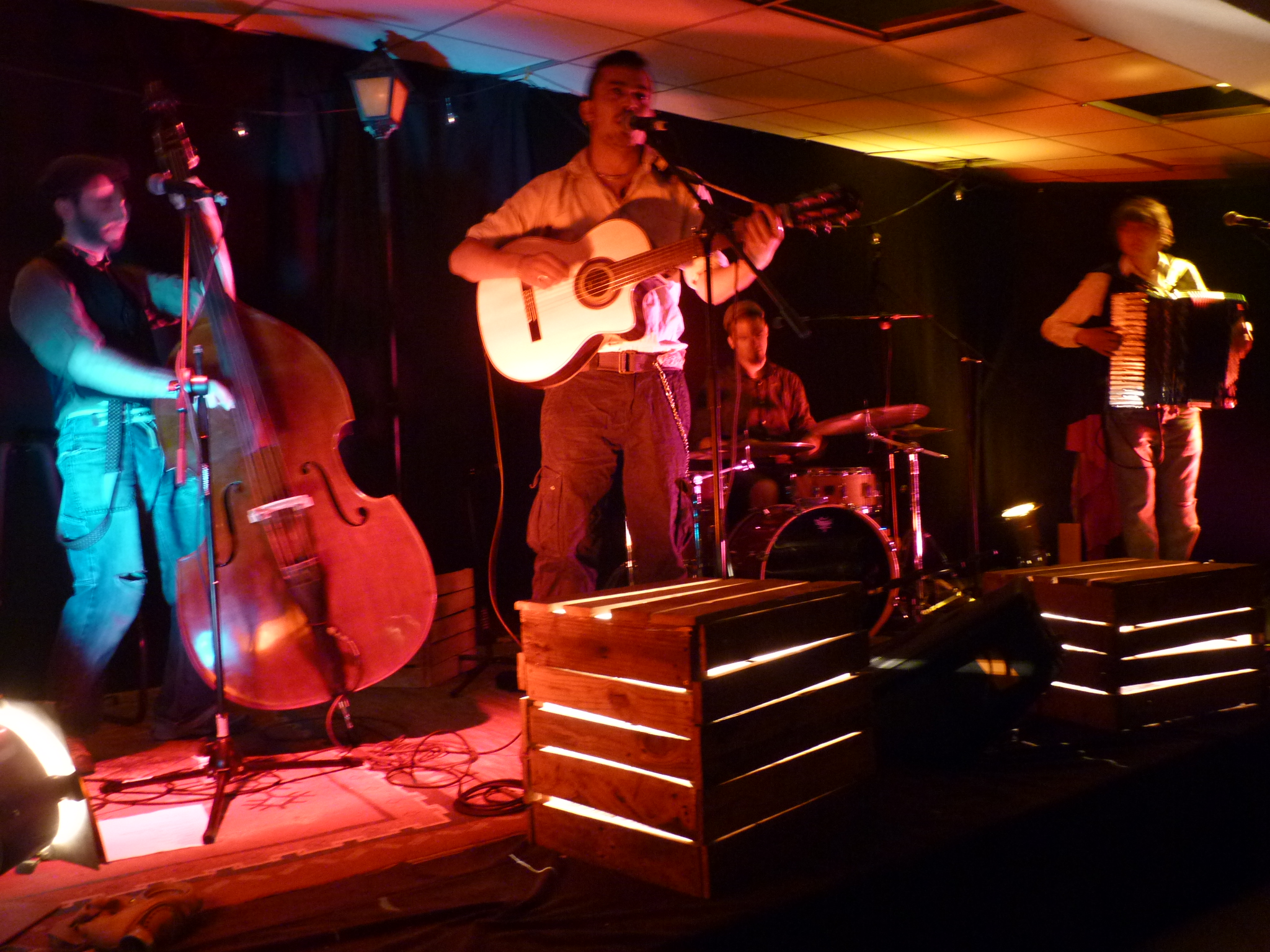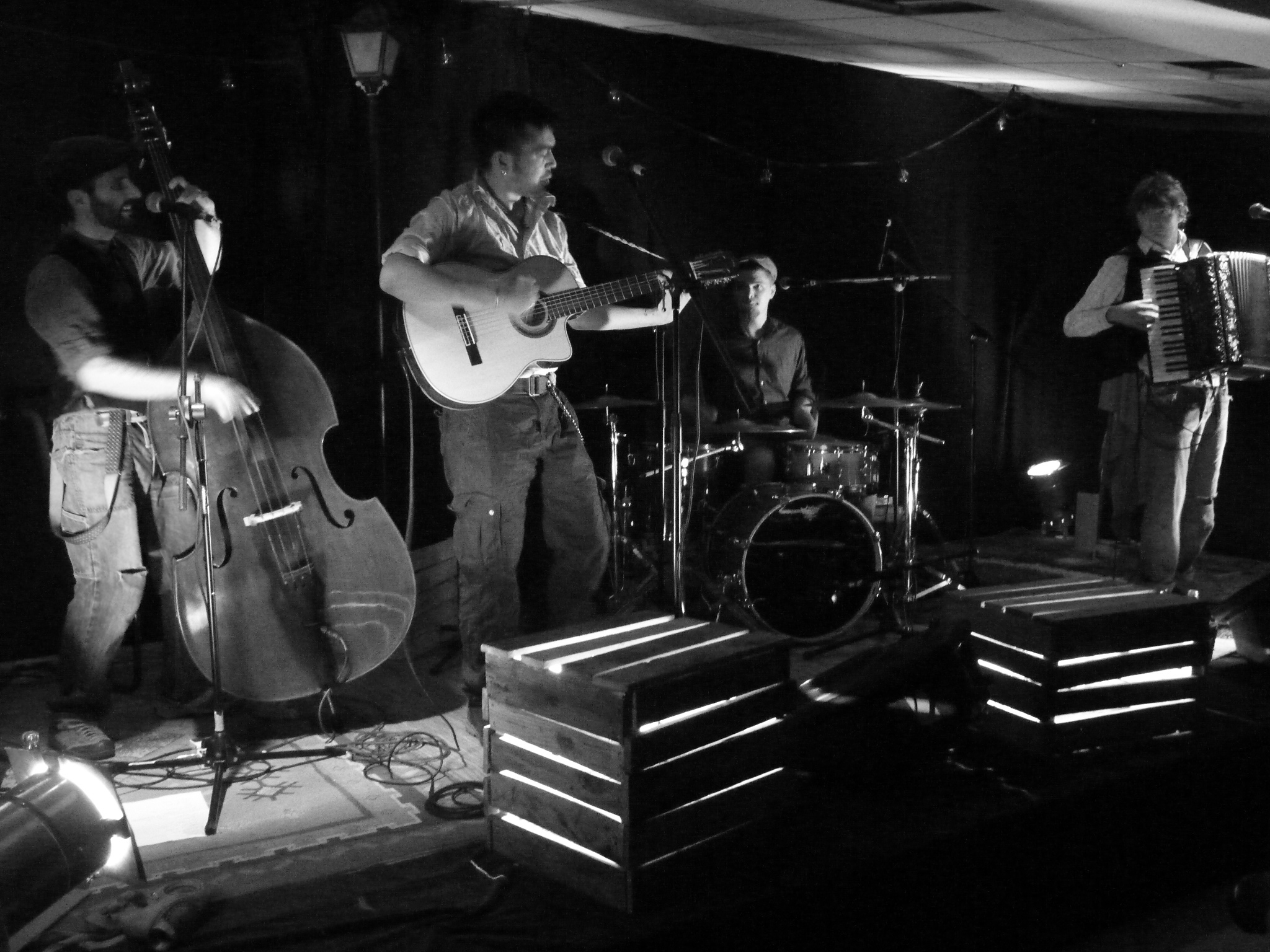Ces musiciens chancellent entre un bal populaire et une cave punk. Accordéon, contrebasse, guitare et batterie en main, ils sont parés à envoyer des morceaux portés par la chanson, le rock et le rap. La plume nourris par l’amertume du quotidien et leurs espoirs libertaires, ils montent sur scène pour embarquer le public dans un joyeux bordel, le sourire aux lèvres et le poing en l’air.
